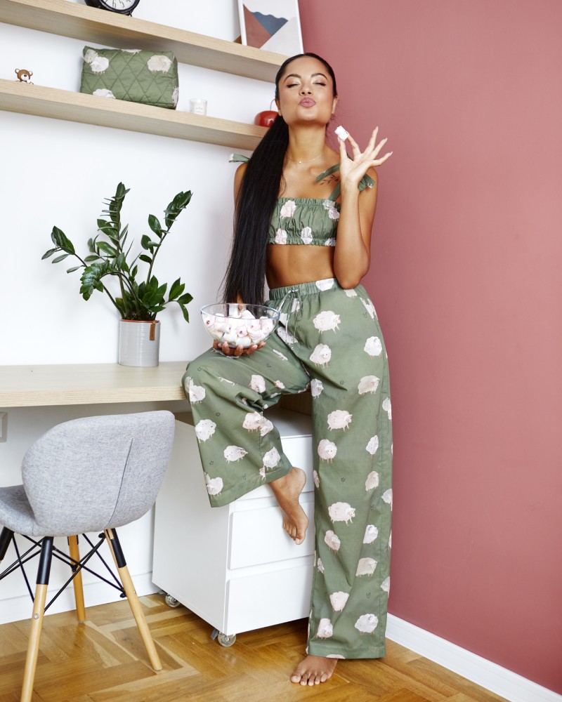 Панталон с дизайнерски принт на овце и свободна кройка. Широк ластик и връзки на талията, дискретни джобове в страничните шевове.