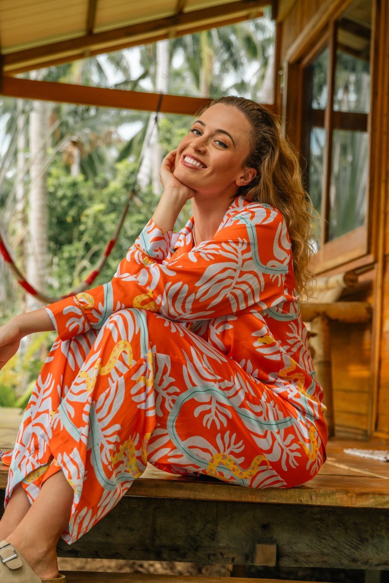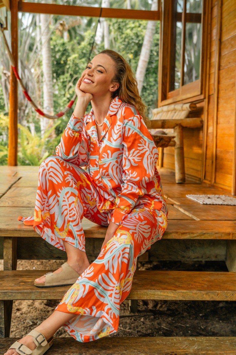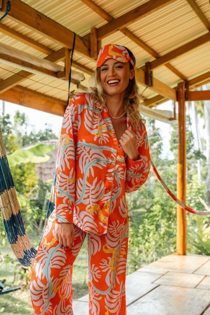 Пижамен сет от нежен и ефирен сатен с дизайнерски принт. Свободна кройка. Горна част тип риза с ревер, кантове от сатен, копчета отпред и цепки в страничните шевове. Широк панталон с ластик и връзка на талията, както и с деликатни странични джобове.